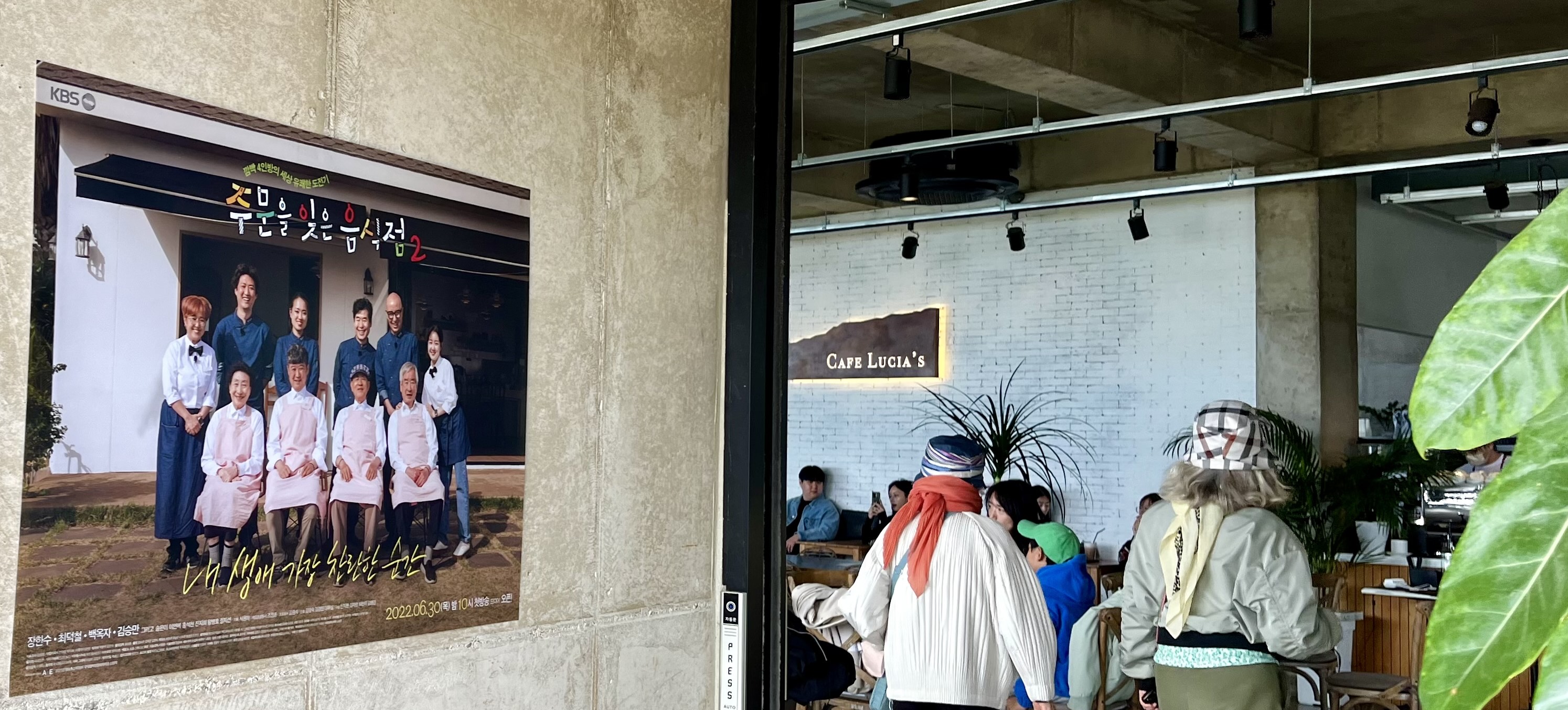 - 카페 루시아. 현관에 TV 프로그램 '주문을 잊은 음식점' 촬영지를 알리는 안내판이 보인다. 빵과 음료를 판매하고, 실내외 공간이 넉넉하게 넓다.