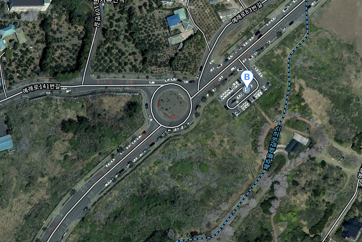 회전교차로 근처에 있는 주차장에 주차하고 몇 걸음 내려가면 바로 공원이다. 주차장 용량보다 많은 방문객이 찾아 위성 지도에서 확인할 수 있는 것처럼 갓길에도 많은 차가 주차해 있다.