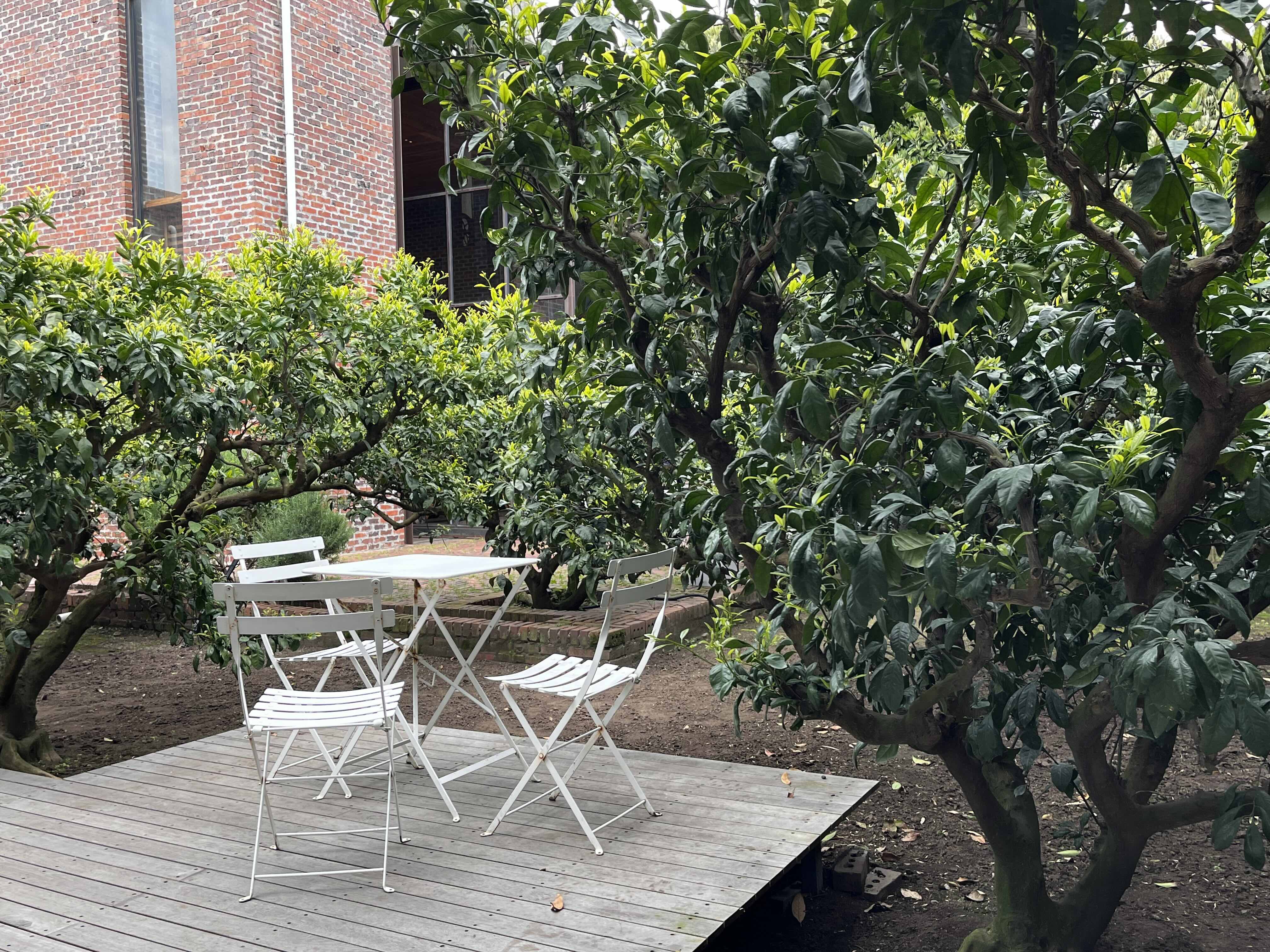 격자 유리로 된 큰 문을 통해 귤나무가 가득한 정원으로 나갈 수 있다.