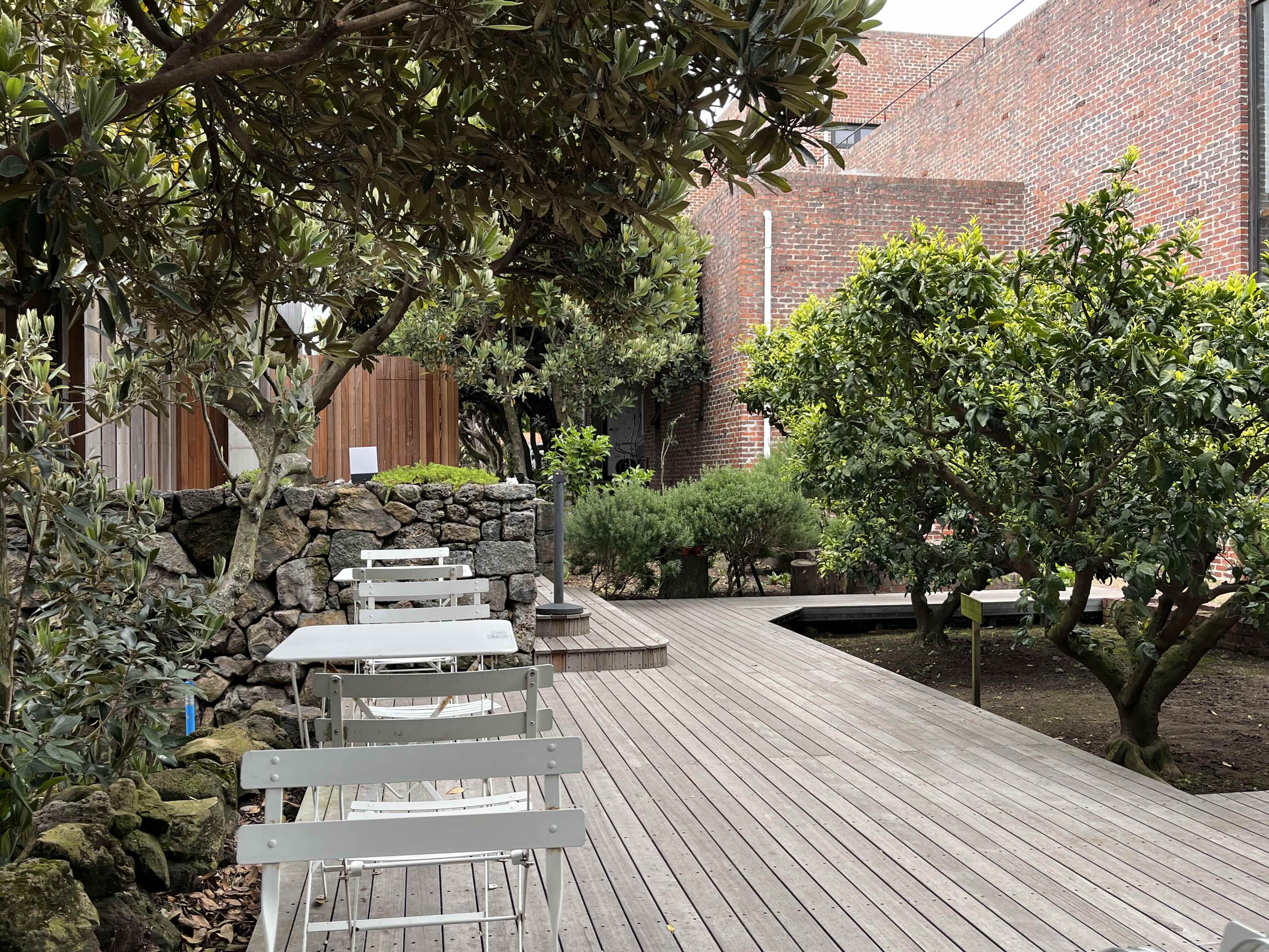 귤나무가 많은 정원 테두리에 만들어진 나무 데크 깔린 실외 테이블 공간이 큰 나무가 만드는 그늘 아래에 있어 시원하고 실내보다 매력적이다. 다만 작은 날벌레 기피제가 비치되어 있는 것으로 보아 여름이 되면 벌레들도 제법 찾아오나 보다.