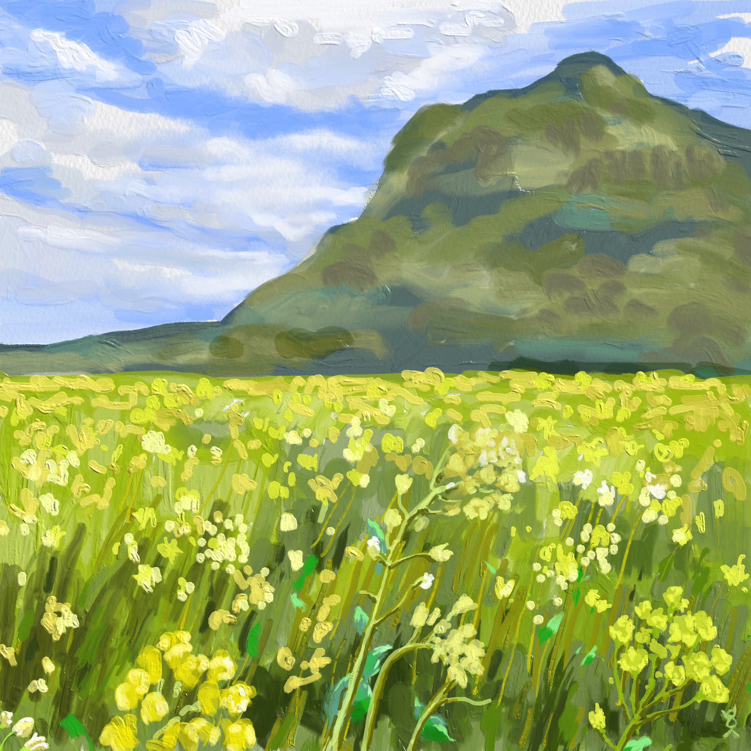 지난 3월 방문하였던 상방산 아래 유채꽃을 그림 두 점으로 남겨 보았다.
