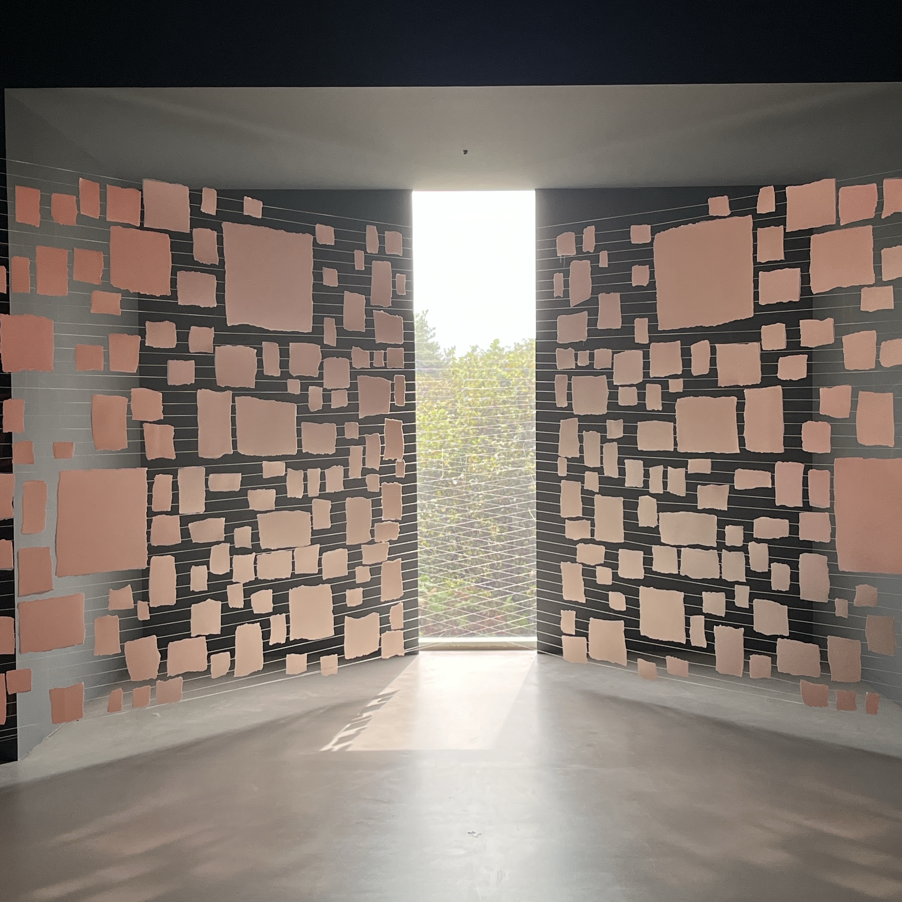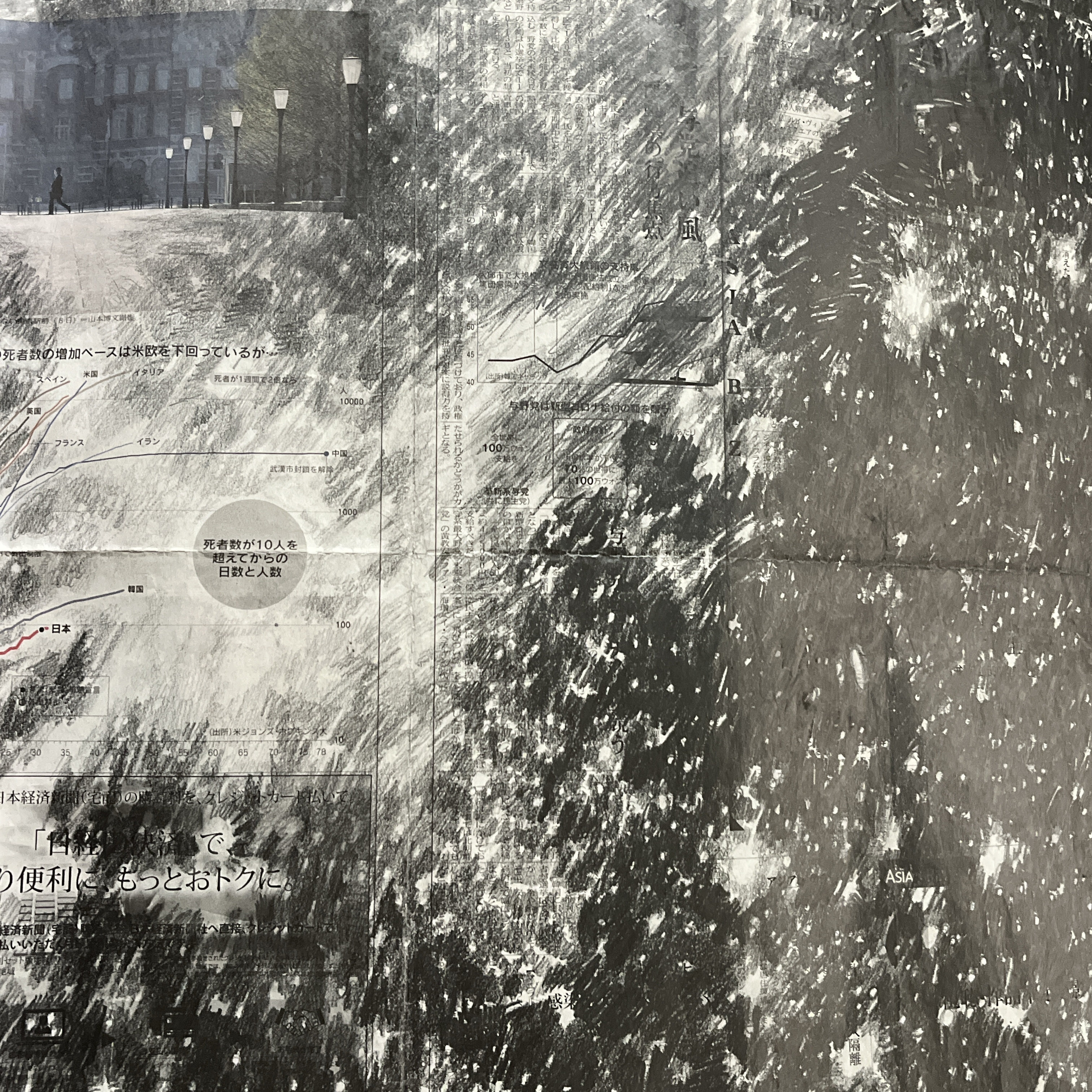 이어지는 수미 카나자와의 작품은 언뜻 보기에 별들이 가득한 우주 공간처럼 보였는데, 수많은 신문지 위에 10B 연필로 선을 그어 만든 작품이라 한다.