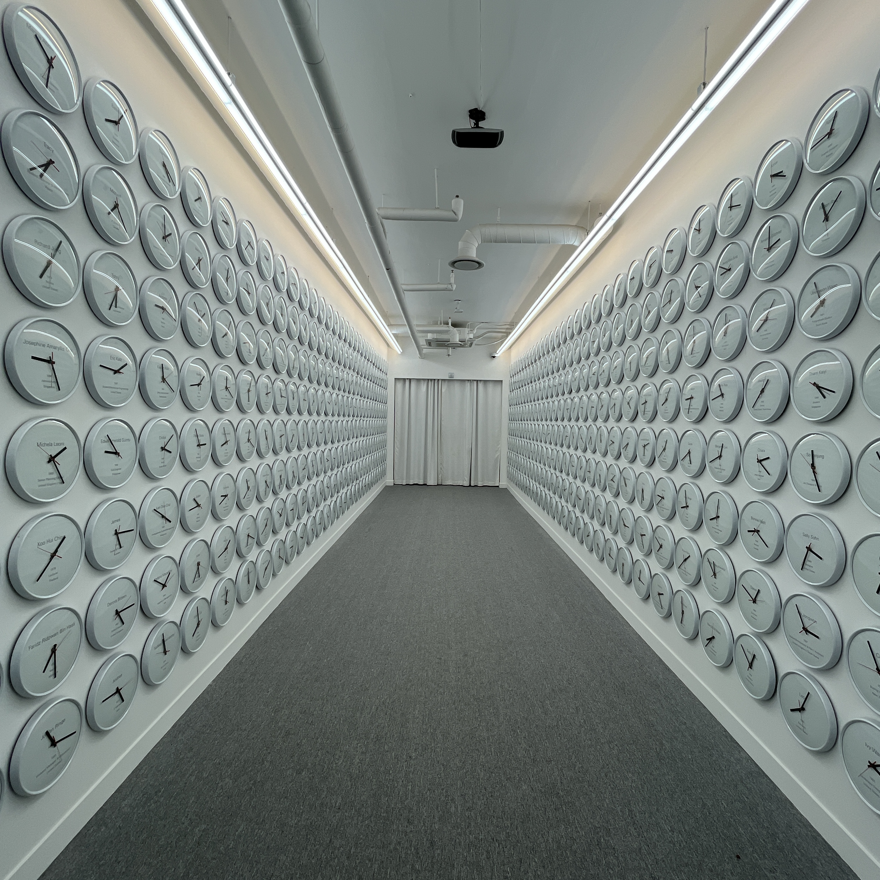 이완 작가는 저마다의 속도로 움직이는 560개의 시계와 인터뷰한 사람들의 음성을 통해 각국 사람들의 서로 다른 시간을 표현했다.